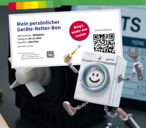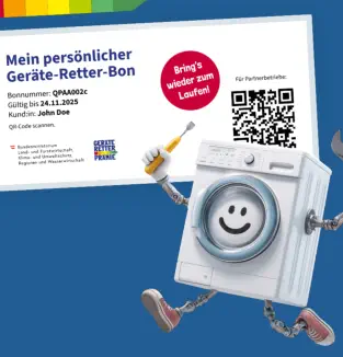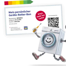 Reparaturkosten gesamt: 126,00 € inkl. MwSt.(z. B. Wien-Pauschale 72,00 Euro + 0,5 Stunde Arbeitszeit)Geräte-Retter-Prämie (50 %): –63,00 EuroIhr tatsächlicher Kostenanteil:63,00 EuroDie Förderung wird nach Einreichung direkt auf Ihr Konto überwiesen.REPARATUR BONUSOffizieller Partnerbetrieb